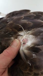 The resident was able to cut the barb of the hook and free the bird’s beak. It was then brought to the CWRC for treatment.